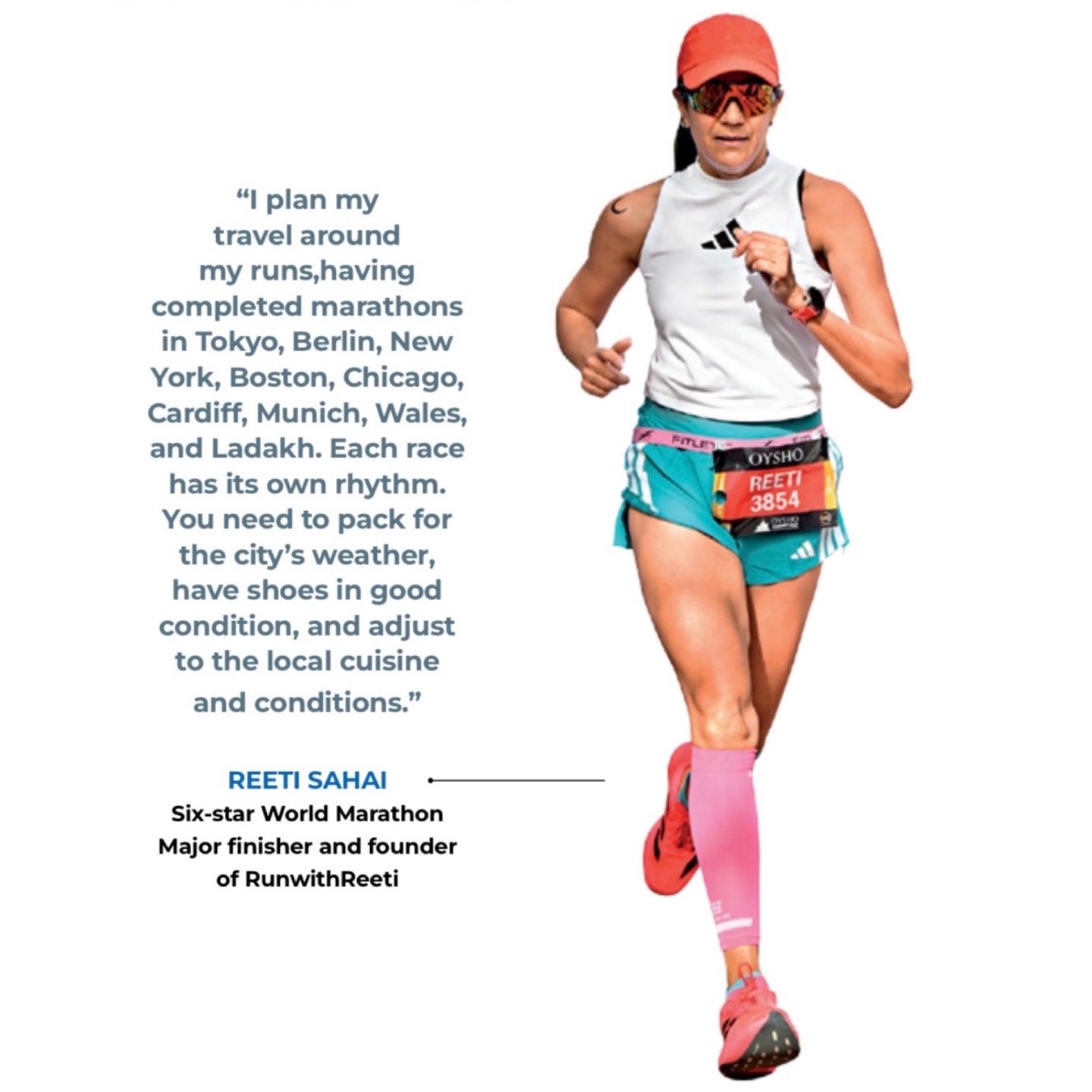 For Reeti Sahai, a six-star World Marathon Major finisher and founder of RunwithReeti with over 250 members in NCR, running is the best way to explore a destination. “I plan my travel around my runs,” she says, having completed marathons in Tokyo, Berlin, New York, Boston, Chicago, Cardiff, Munich, Wales, and Ladakh. “Each race has its own rhythm. You need to pack for the city’s weather, have shoes in good condition, and adjust to the local cuisine and conditions,” she advises. Arriving early for long-haul races, a week in advance for the US, and at least 3–4 days for Europe to acclimatise and beat jet lag are her running tips.