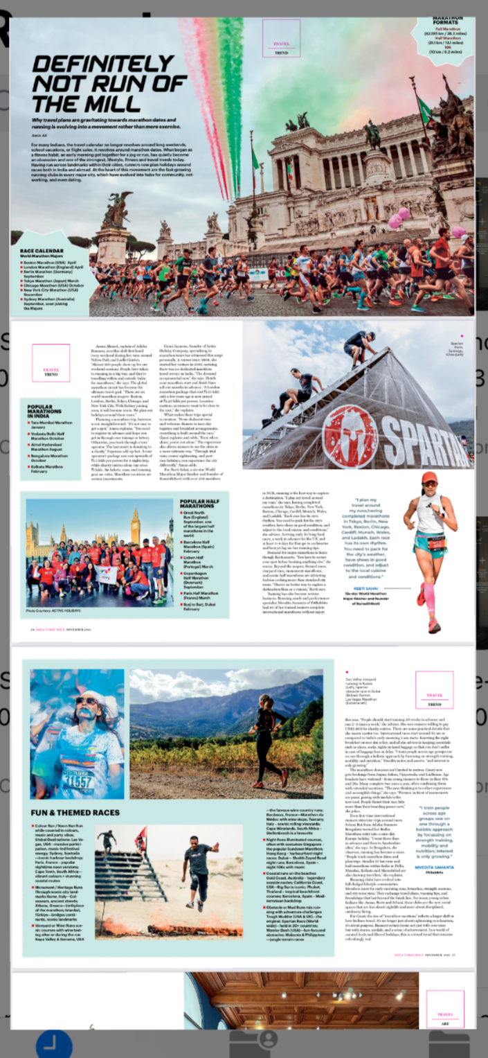 Training has also become serious business. Running coach and performance specialist Nivedita Samanta of FitRabbits had 40 of her trained runners complete international marathons without injury this year. “People should start training 20 weeks in advance and run 2–3 times a week,” she advises. She sees runners willing to pay US$2,000 for charity entries. There are some practical details that she insists matter too. International races start around 10 am as compared India’s early-morning 5 am starts. Knowing the right breakfast on race day is key, and all she advices keeping essentials such as shoes, socks, tights in hand luggage so that you don’t suffer in case of baggage loss or delay. “I train people across age groups one on one through a holistic approach by focusing on strength training, mobility and nutrition,” Nivedita notes and asserts, “Interest is only growing.”